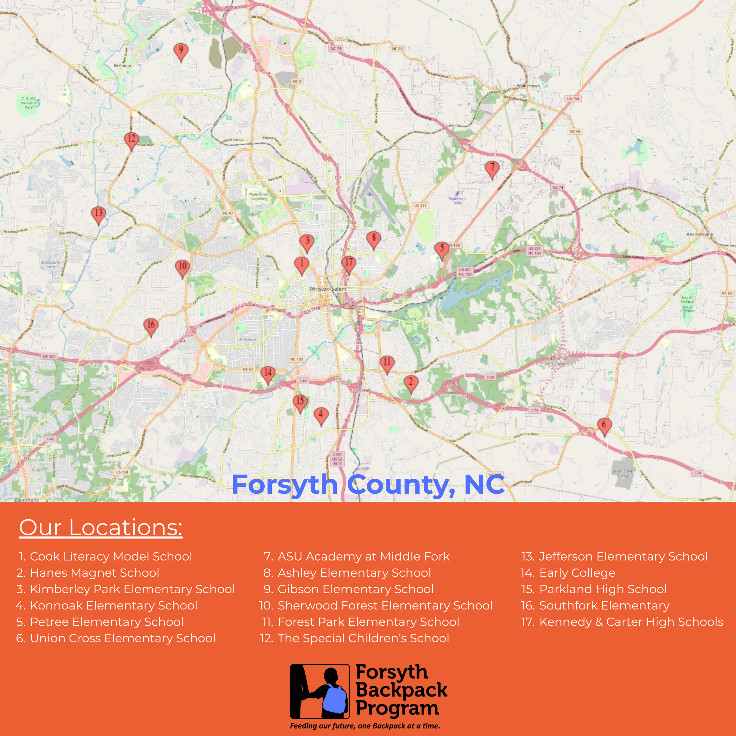 Forsyth Backpack Program is responsible for picking up and distributing the meals to the schools and providing volunteers when needed. Our partners at Second Harvest Food Bank provide regulatory oversight and are the hub for ordering the Backpack food items.